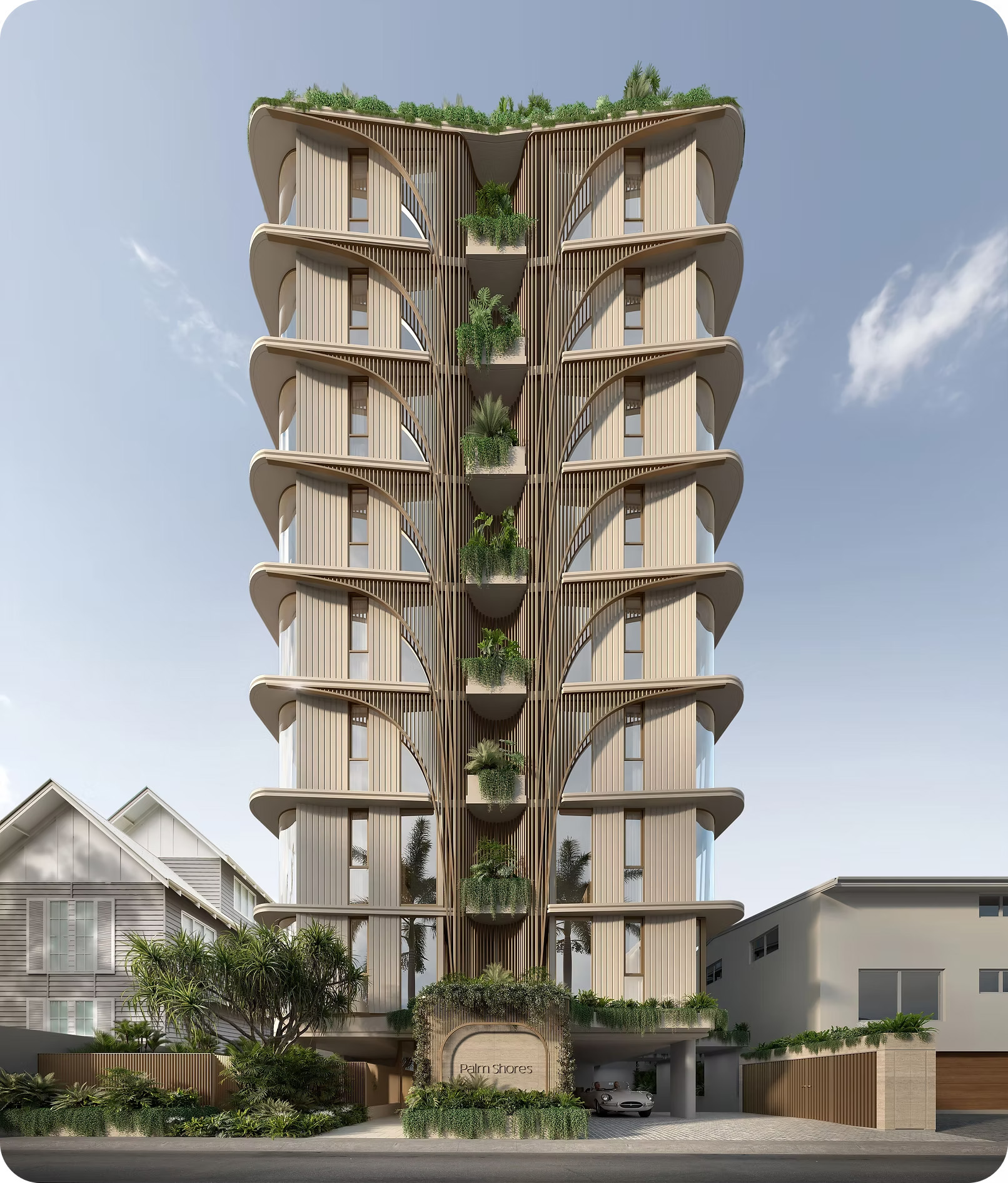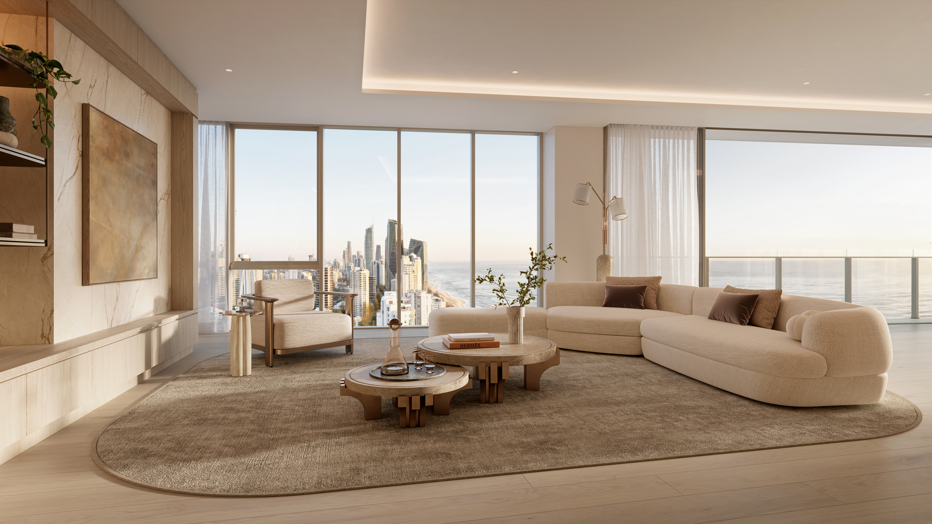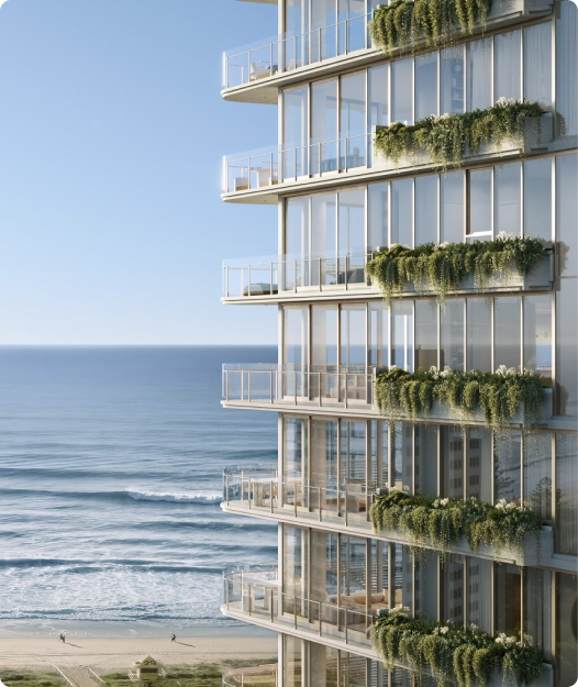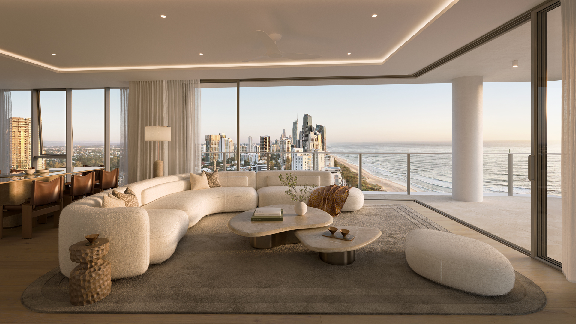 Stone, timber, and concrete work with salt air and weather—materials that gain patina rather than fight the coast. Sand tones, driftwood greys, worn-shell whites create palettes pulled from the beach itself. Every apartment enjoys a full northern aspect, capturing ocean, city skyline & hinterland views, while cross-ventilation through glazed openings invites cooling breezes throughout. These are homes designed for barefoot mornings, doors thrown open to subtropical air, and seamless indoor-outdoor flow that defines real coastal living.